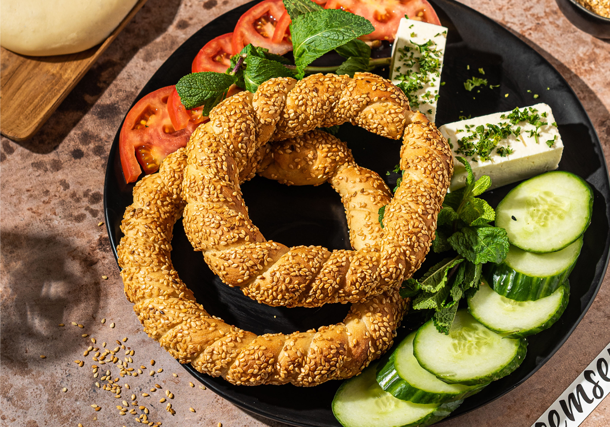 Sesame bread twist served with tomatoes, cucumber and feta cheese.